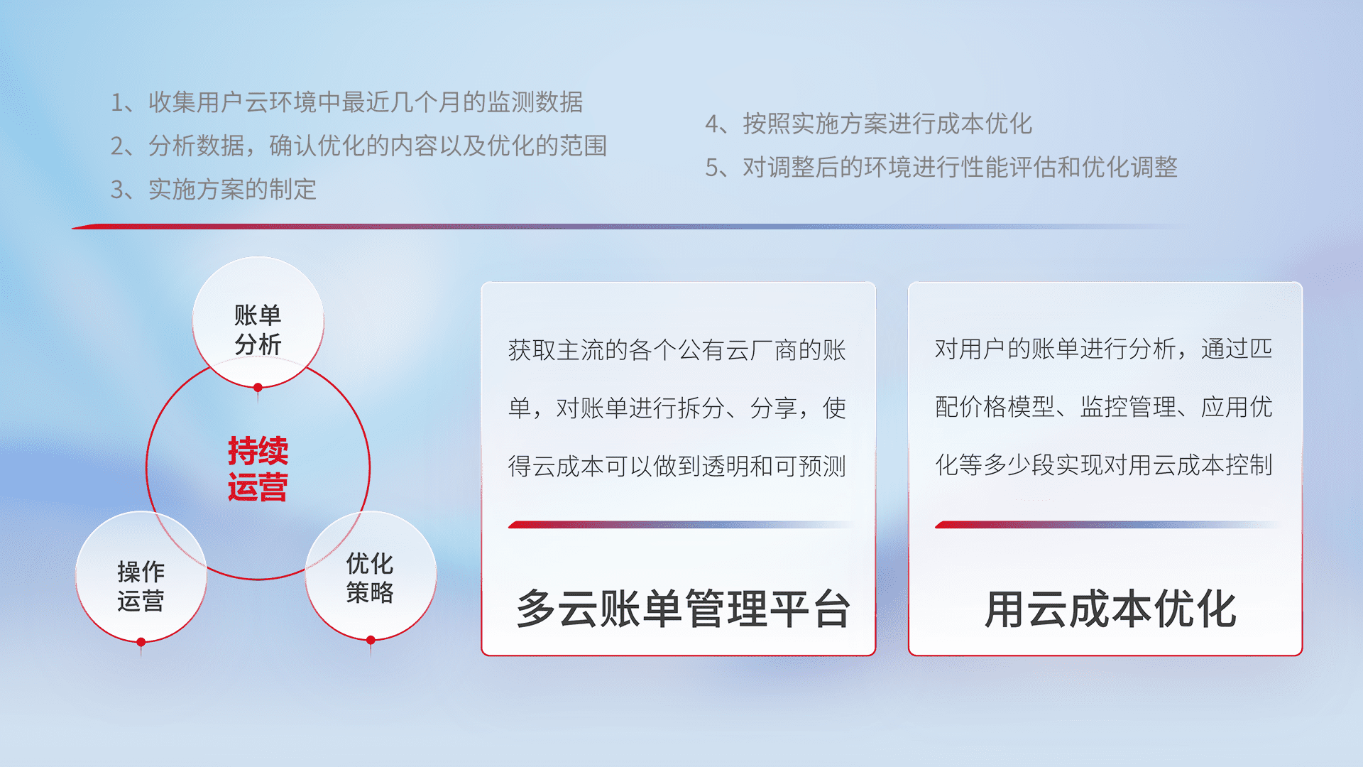 通过多云纳管,,,以统一的资源数据模型把客户的云资源进行抽象和封装,,进而实现对多云资源的统一操作,,,,保障云资源管理的可靠性、、稳定性与可用性。。。。量身定制化运维内容,,配置、、、开发运维、、、补丁管理、、、、备份、、监控、、、、认证和访问管理、、审计和日常巡检等,,保障在用云过程中的可靠度,,稳定度以及高可用率。。。。
